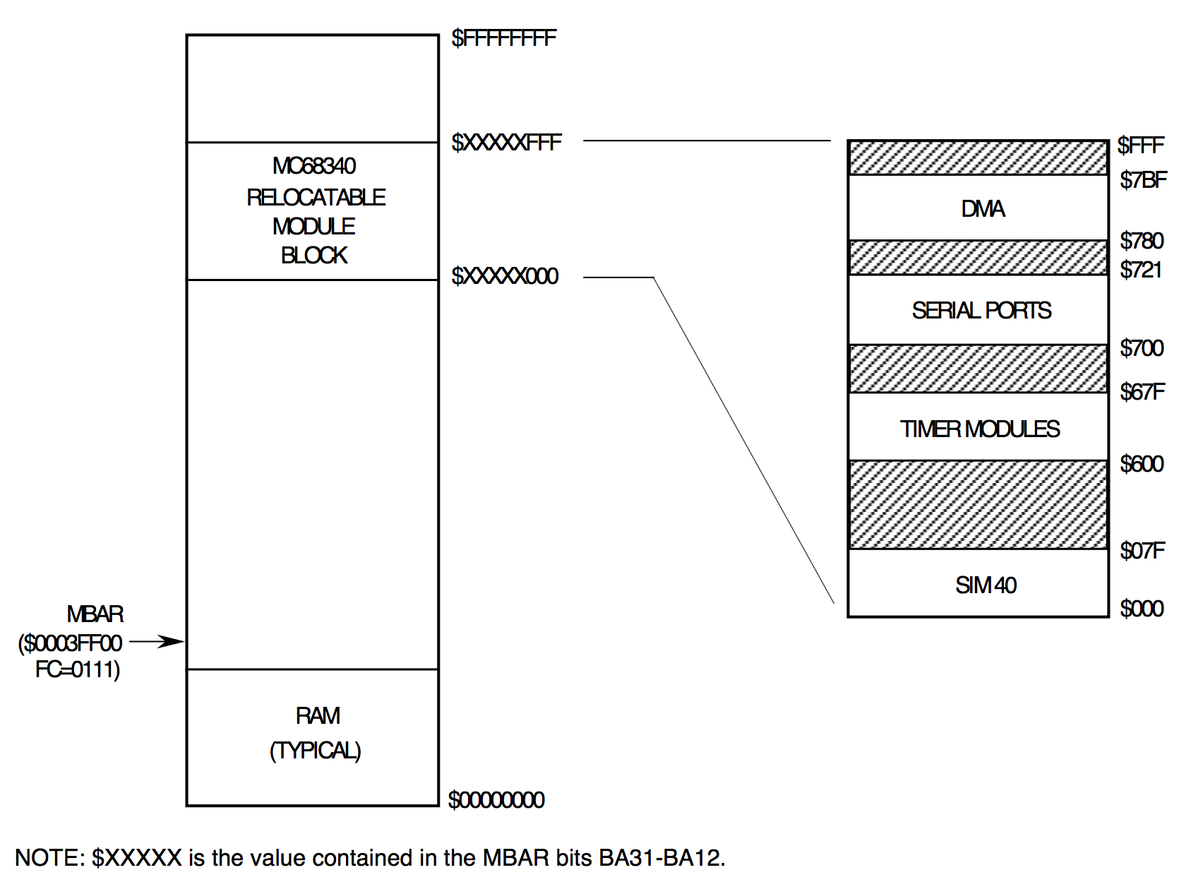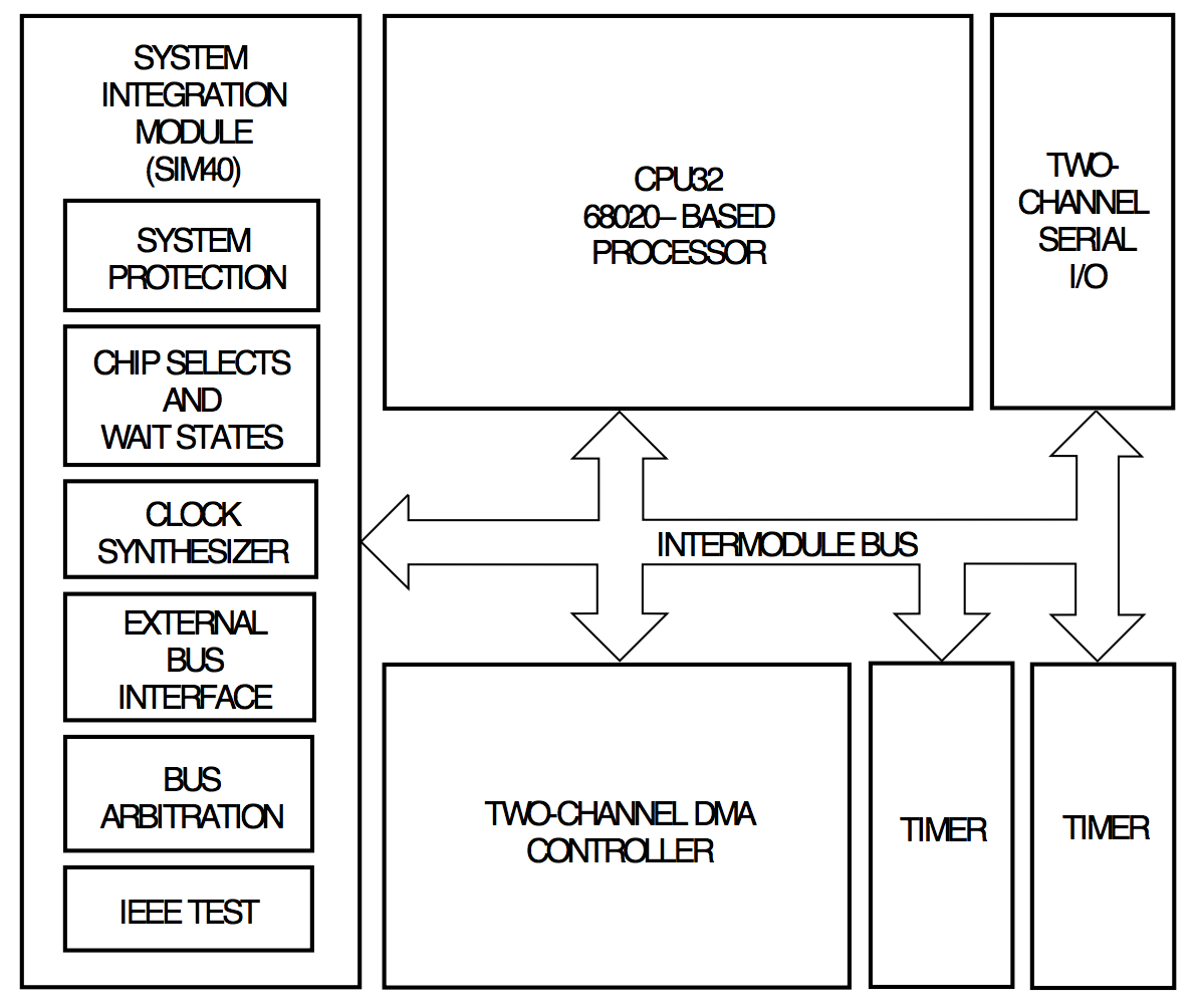 The MC68340 has a great suite of peripherals, from UARTs, Timers, System protection devices and DMA.